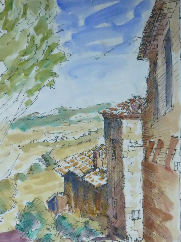 The above are examples of Landscape sketches using watercolours. Firstly I draw the outline of the scene using some type of drawing tool - a pencil, pen or marker. Then I build up the colours using transparent watercolours. The first two images below show the initial outline drawing of a simple subject, and the finished Coloured Sketch. The third image is of a Colour Sketch done in Italy, using quality watercolour paper and permanent ink drawing pen.